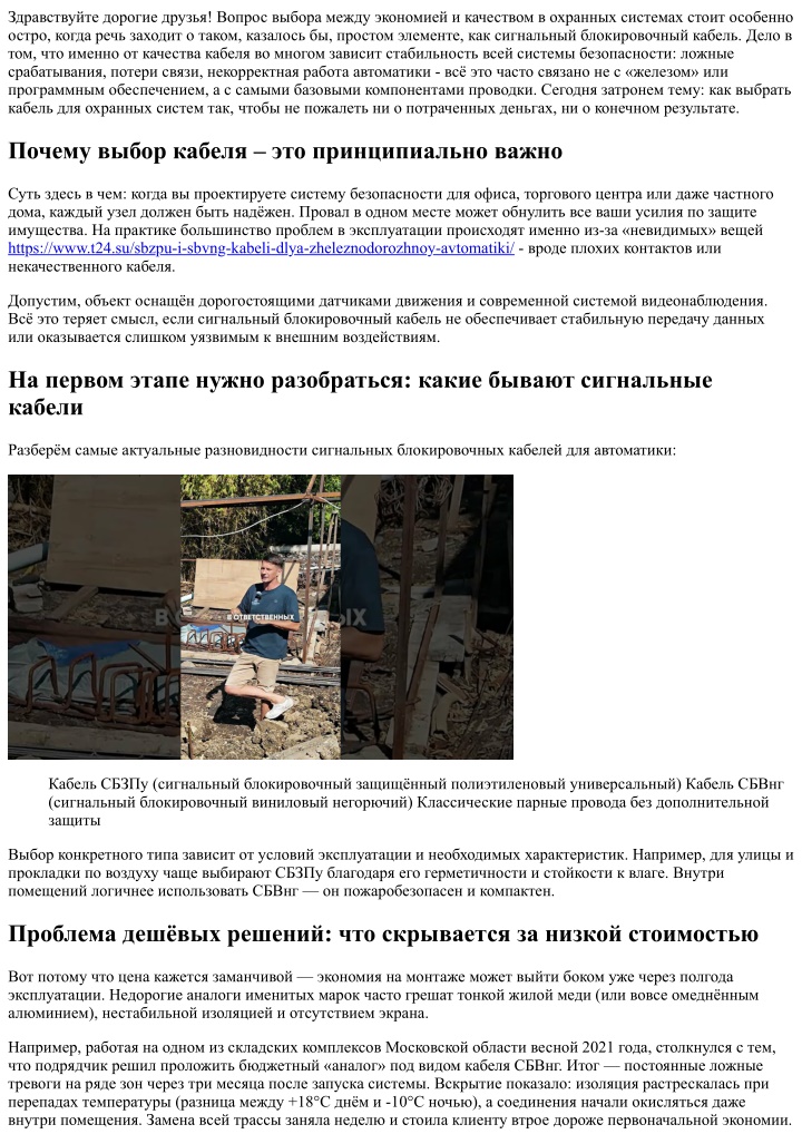 Здравствуйте дорогие друзья! Вопрос выбора между экономией и качеством в охранных системах стоит особенно остро, когда речь заходит о таком, казалось бы, простом элементе, как сигнальный блокировочный кабель. Дело в том, что именно от качества кабеля во многом зависит стабильность всей системы безопасности: ложные срабатывания, потери связи, некорректная работа автоматики - всё это часто связано не с «железом» или программным обеспечением, а с самыми базовыми компонентами проводки. Сегодня затронем тему: как выбрать кабель для охранных систем так, чтобы не пожалеть ни о потраченных деньгах, ни о конечном результате. Почему выбор кабеля – это принципиально важно Суть здесь в чем: когда вы проектируете систему безопасности для офиса, торгового центра или даже частного дома, каждый узел должен быть надёжен. Провал в одном месте может обнулить все ваши усилия по защите имущества. На практике большинство проблем в эксплуатации происходят именно из-за «невидимых» вещей https://www.t24.su/sbzpu-i-sbvng-kabeli-dlya-zheleznodorozhnoy-avtomatiki/ - вроде плохих контактов или некачественного кабеля. Допустим, объект оснащён дорогостоящими датчиками движения и современной системой видеонаблюдения. Всё это теряет смысл, если сигнальный блокировочный кабель не обеспечивает стабильную передачу данных или оказывается слишком уязвимым к внешним воздействиям. На первом этапе нужно разобраться: какие бывают сигнальные кабели Разберём самые актуальные разновидности сигнальных блокировочных кабелей для автоматики: Кабель СБЗПу (сигнальный блокировочный защищённый полиэтиленовый универсальный) Кабель СБВнг (сигнальный блокировочный виниловый негорючий) Классические парные провода без дополнительной защиты Выбор конкретного типа зависит от условий эксплуатации и необходимых характеристик. Например, для улицы и прокладки по воздуху чаще выбирают СБЗПу благодаря его герметичности и стойкости к влаге. Внутри помещений логичнее использовать СБВнг — он пожаробезопасен и компактен. Проблема дешёвых решений: что скрывается за низкой стоимостью Вот потому что цена кажется заманчивой — экономия на монтаже может выйти боком уже через полгода эксплуатации. Недорогие аналоги именитых марок часто грешат тонкой жилой меди (или вовсе омеднённым алюминием), нестабильной изоляцией и отсутствием экрана. Например, работая на одном из складских комплексов Московской области весной 2021 года, столкнулся с тем, что подрядчик решил проложить бюджетный «аналог» под видом кабеля СБВнг. Итог — постоянные ложные тревоги на ряде зон через три месяца после запуска системы. Вскрытие показало: изоляция растрескалась при перепадах температуры (разница между +18°C днём и -10°C ночью), а соединения начали окисляться даже внутри помещения. Замена всей трассы заняла неделю и стоила клиенту втрое дороже первоначальной экономии.