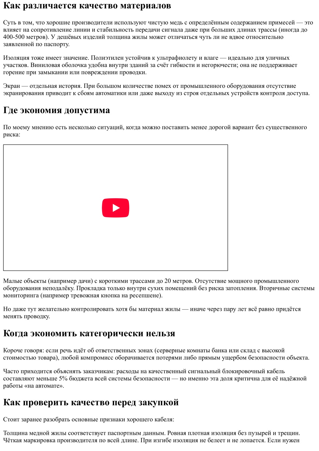 Как различается качество материалов Суть в том, что хорошие производители используют чистую медь с определённым содержанием примесей — это влияет на сопротивление линии и стабильность передачи сигнала даже при больших длинах трассы (иногда до 400-500 метров). У дешёвых изделий толщина жилы может отличаться чуть ли не вдвое относительно заявленной по паспорту. Изоляция тоже имеет значение. Полиэтилен устойчив к ультрафиолету и влаге — идеально для уличных участков. Виниловая оболочка удобна внутри зданий за счёт гибкости и негорючести; она не поддерживает горение при замыкании или повреждении проводки. Экран — отдельная история. При большом количестве помех от промышленного оборудования отсутствие экранирования приводит к сбоям автоматики или даже выходу из строя отдельных устройств контроля доступа. Где экономия допустима По моему мнению есть несколько ситуаций, когда можно поставить менее дорогой вариант без существенного риска: Малые объекты (например дачи) с короткими трассами до 20 метров. Отсутствие мощного промышленного оборудования неподалёку. Прокладка только внутри сухих помещений без риска затопления. Вторичные системы мониторинга (например тревожная кнопка на ресепшене). Но даже тут желательно контролировать хотя бы материал жилы — иначе через пару лет всё равно придётся менять проводку. Когда экономить категорически нельзя Короче говоря: если речь идёт об ответственных зонах (серверные комнаты банка или склад с высокой стоимостью товара), любой компромисс оборачивается потерями либо прямым ущербом безопасности объекта. Часто приходится объяснять заказчикам: расходы на качественный сигнальный блокировочный кабель составляют меньше 5% бюджета всей системы безопасности — но именно эта доля критична для её надёжной работы «на автомате». Как проверить качество перед закупкой Стоит заранее разобрать основные признаки хорошего кабеля: Толщина медной жилы соответствует паспортным данным. Ровная плотная изоляция без пузырей и трещин. Чёткая маркировка производителя по всей длине. При изгибе изоляция не белеет и не лопается. Если нужен