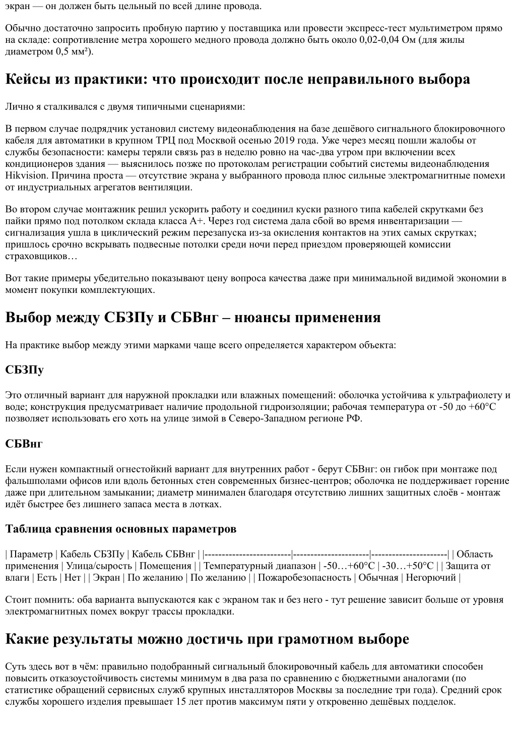 экран — он должен быть цельный по всей длине провода. Обычно достаточно запросить пробную партию у поставщика или провести экспресс-тест мультиметром прямо на складе: сопротивление метра хорошего медного провода должно быть около 0,02-0,04 Ом (для жилы диаметром 0,5 мм²). Кейсы из практики: что происходит после неправильного выбора Лично я сталкивался с двумя типичными сценариями: В первом случае подрядчик установил систему видеонаблюдения на базе дешёвого сигнального блокировочного кабеля для автоматики в крупном ТРЦ под Москвой осенью 2019 года. Уже через месяц пошли жалобы от службы безопасности: камеры теряли связь раз в неделю ровно на час-два утром при включении всех кондиционеров здания — выяснилось позже по протоколам регистрации событий системы видеонаблюдения Hikvision. Причина проста — отсутствие экрана у выбранного провода плюс сильные электромагнитные помехи от индустриальных агрегатов вентиляции. Во втором случае монтажник решил ускорить работу и соединил куски разного типа кабелей скрутками без пайки прямо под потолком склада класса А+. Через год система дала сбой во время инвентаризации — сигнализация ушла в циклический режим перезапуска из-за окисления контактов на этих самых скрутках; пришлось срочно вскрывать подвесные потолки среди ночи перед приездом проверяющей комиссии страховщиков… Вот такие примеры убедительно показывают цену вопроса качества даже при минимальной видимой экономии в момент покупки комплектующих. Выбор между СБЗПу и СБВнг – нюансы применения На практике выбор между этими марками чаще всего определяется характером объекта: СБЗПу Это отличный вариант для наружной прокладки или влажных помещений: оболочка устойчива к ультрафиолету и воде; конструкция предусматривает наличие продольной гидроизоляции; рабочая температура от -50 до +60°C позволяет использовать его хоть на улице зимой в Северо-Западном регионе РФ. СБВнг Если нужен компактный огнестойкий вариант для внутренних работ - берут СБВнг: он гибок при монтаже под фальшполами офисов или вдоль бетонных стен современных бизнес-центров; оболочка не поддерживает горение даже при длительном замыкании; диаметр минимален благодаря отсутствию лишних защитных слоёв - монтаж идёт быстрее без лишнего запаса места в лотках. Таблица сравнения основных параметров | Параметр | Кабель СБЗПу | Кабель СБВнг | |-------------------------|----------------------|----------------------| | Область применения | Улица/сырость | Помещения | | Температурный диапазон | -50…+60°C | -30…+50°C | | Защита от влаги | Есть | Нет | | Экран | По желанию | По желанию | | Пожаробезопасность | Обычная | Негорючий | Стоит помнить: оба варианта выпускаются как с экраном так и без него - тут решение зависит больше от уровня электромагнитных помех вокруг трассы прокладки. Какие результаты можно достичь при грамотном выборе Суть здесь вот в чём: правильно подобранный сигнальный блокировочный кабель для автоматики способен повысить отказоустойчивость системы минимум в два раза по сравнению с бюджетными аналогами (по статистике обращений сервисных служб крупных инсталляторов Москвы за последние три года). Средний срок службы хорошего изделия превышает 15 лет против максимум пяти у откровенно дешёвых подделок.