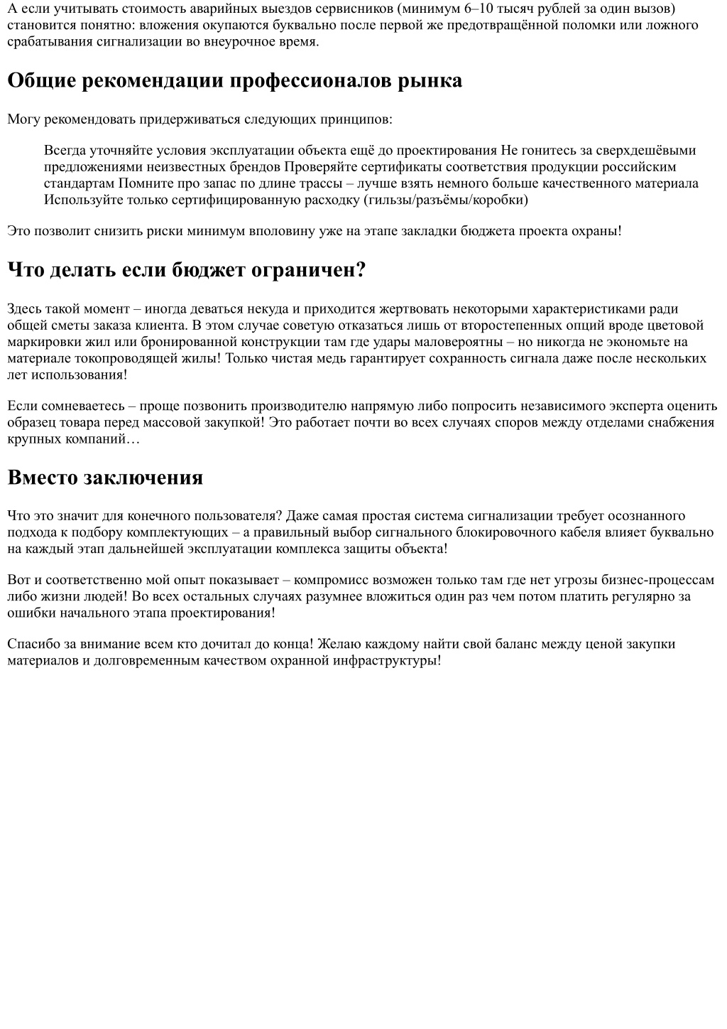 А если учитывать стоимость аварийных выездов сервисников (минимум 6–10 тысяч рублей за один вызов) становится понятно: вложения окупаются буквально после первой же предотвращённой поломки или ложного срабатывания сигнализации во внеурочное время. Общие рекомендации профессионалов рынка Могу рекомендовать придерживаться следующих принципов: Всегда уточняйте условия эксплуатации объекта ещё до проектирования Не гонитесь за сверхдешёвыми предложениями неизвестных брендов Проверяйте сертификаты соответствия продукции российским стандартам Помните про запас по длине трассы – лучше взять немного больше качественного материала Используйте только сертифицированную расходку (гильзы/разъёмы/коробки) Это позволит снизить риски минимум вполовину уже на этапе закладки бюджета проекта охраны! Что делать если бюджет ограничен? Здесь такой момент – иногда деваться некуда и приходится жертвовать некоторыми характеристиками ради общей сметы заказа клиента. В этом случае советую отказаться лишь от второстепенных опций вроде цветовой маркировки жил или бронированной конструкции там где удары маловероятны – но никогда не экономьте на материале токопроводящей жилы! Только чистая медь гарантирует сохранность сигнала даже после нескольких лет использования! Если сомневаетесь – проще позвонить производителю напрямую либо попросить независимого эксперта оценить образец товара перед массовой закупкой! Это работает почти во всех случаях споров между отделами снабжения крупных компаний… Вместо заключения Что это значит для конечного пользователя? Даже самая простая система сигнализации требует осознанного подхода к подбору комплектующих – а правильный выбор сигнального блокировочного кабеля влияет буквально на каждый этап дальнейшей эксплуатации комплекса защиты объекта! Вот и соответственно мой опыт показывает – компромисс возможен только там где нет угрозы бизнес-процессам либо жизни людей! Во всех остальных случаях разумнее вложиться один раз чем потом платить регулярно за ошибки начального этапа проектирования! Спасибо за внимание всем кто дочитал до конца! Желаю каждому найти свой баланс между ценой закупки материалов и долговременным качеством охранной инфраструктуры!