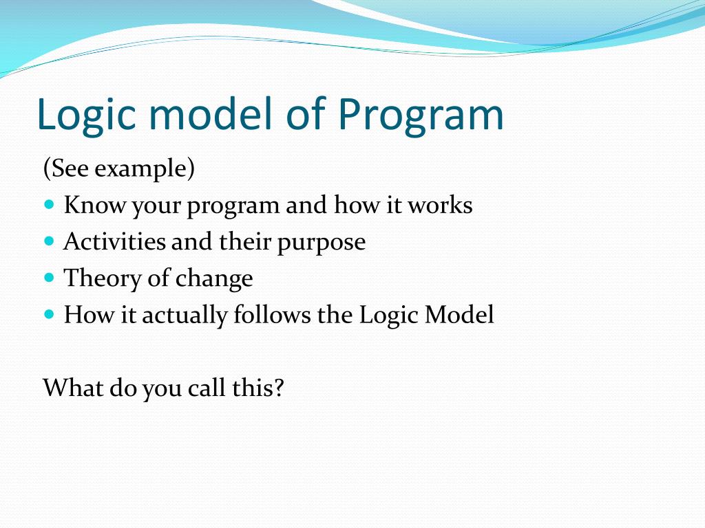Logic model of Program (See example) • Know your program and how it works • Activities and their purpose • Theory of change • How it actually follows the Logic Model What do you call this?