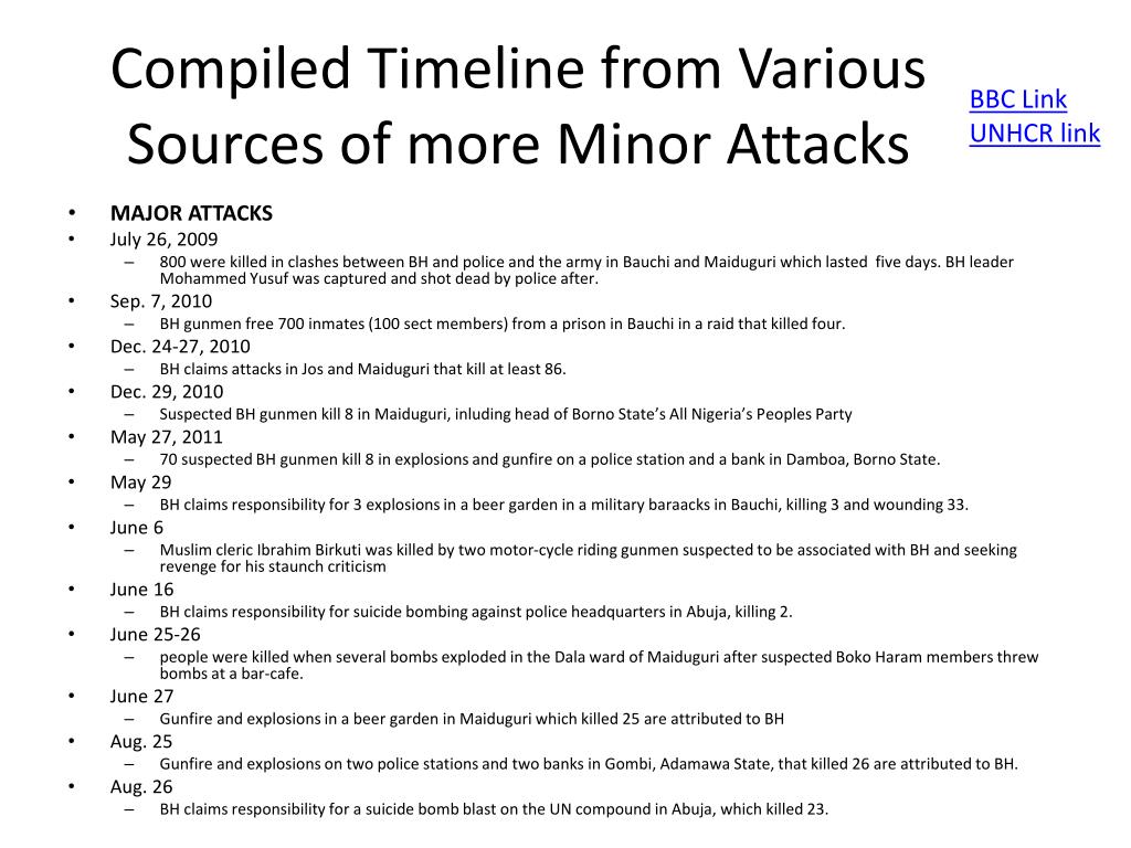 Compiled Timeline from Various Sources of more Minor Attacks BBC Link UNHCR link • MAJOR ATTACKS • July 26, 2009 • 800 were killed in clashes between BH and police and the army in Bauchi and Maiduguri which lasted five days. BH leader Mohammed Yusuf was captured and shot dead by police after. • Sep. 7, 2010 • BH gunmen free 700 inmates (100 sect members) from a prison in Bauchiin a raid that killed four. • Dec. 24-27, 2010 • BH claims attacks in Jos and Maiduguri that kill at least 86. • Dec. 29, 2010 • Suspected BH gunmen kill 8 in Maiduguri, inluding head of BornoState’s All Nigeria’s Peoples Party • May 27, 2011 • 70 suspected BH gunmen kill 8 in explosions and gunfire on a police station and a bank in Damboa, Borno State. • May 29 • BH claims responsibility for 3 explosions in a beer garden in a military baraacks in Bauchi, killing 3 and wounding 33. • June 6 • Muslim cleric Ibrahim Birkuti was killed by two motor-cycle riding gunmen suspected to be associated with BH and seeking revenge for his staunch criticism • June 16 • BH claims responsibility for suicide bombing against police headquarters in Abuja, killing 2. • June 25-26 • people were killed when several bombs exploded in the Dala ward of Maiduguri after suspected Boko Haram members threw bombs at a bar-cafe. • June 27 • Gunfire and explosions in a beer garden in Maiduguri which killed 25 are attributed to BH • Aug. 25 • Gunfire and explosions on two police stations and two banks in Gombi, Adamawa State, that killed 26 are attributed to BH. • Aug. 26 • BH claims responsibility for a suicide bomb blast on the UN compound in Abuja, which killed 23.