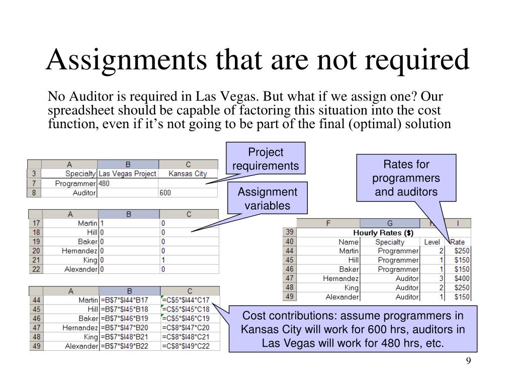 Assignments that are not required No Auditor is required in Las Vegas. But what if we assign one? Our spreadsheet should be capable of factoring this situation into the cost function, even if it’s not going to be part of the final (optimal) solution Project requirements Rates for programmers and auditors Assignment variables Cost contributions: assume programmers in Kansas City will work for 600 hrs, auditors in Las Vegas will work for 480 hrs, etc.