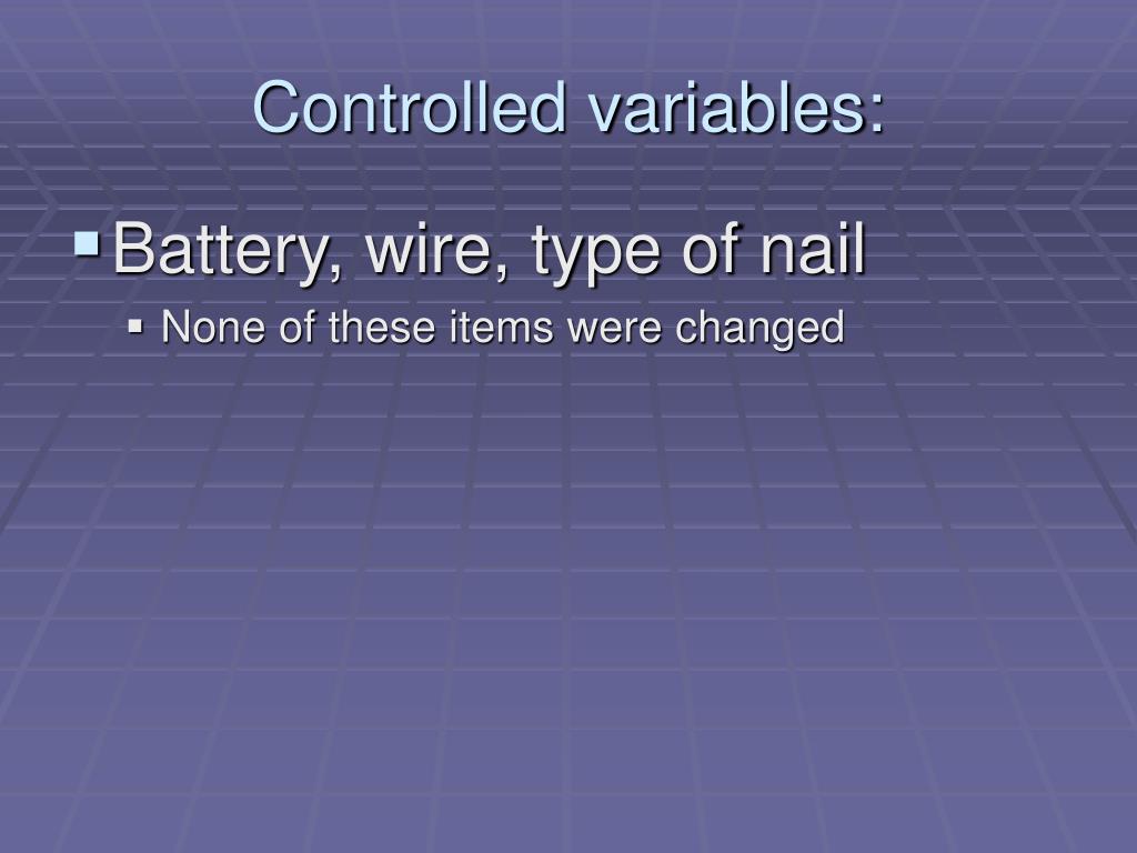 Controlled variables: • Battery, wire, type of nail • None of these items were changed