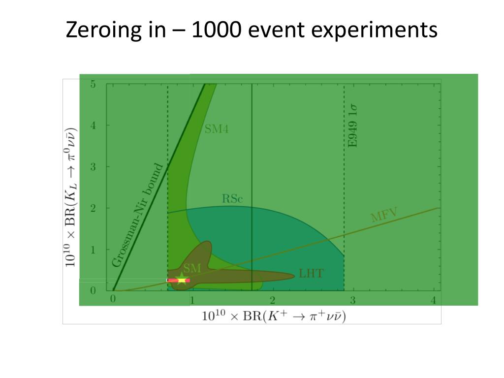 A long distance to go • We start off with what I’d classify as a 3700 event experiment. • The absorptive piece can be well-determined by measuring KL® gg • Subtracting it gives Bdisp(KL+-)= (3.2±1.2)´10-10 • I.e. a number ~20 times smaller than the absorptive part • And ~3 times smaller than SM fits to the short-distance part! • This corresponds to a 7 event experiment! Nature is a real killjoy. • And this is before trying to untangle the dispersive interference. • Where there’s agreement from all sectors of the theory world that this is very difficult! • What could possibly be done? • The experiment can be done better – I never imagined it would be worth it. • Could imagine 5´smaller errors, would correspond to a ~200 event experiment for the dispersive part. • Then the theorists could do their part. If they were perfect, and the true value was ~ the SM-predicted one, could get to 500 event equivalent. So it might be worth considering • But theorists really have to do well. A 10% error on the dispersive amplitude degrades it to a 100 equivalent event experiment