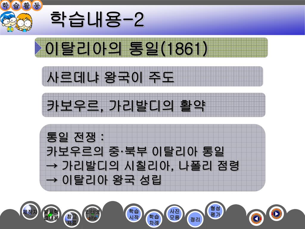 학 습 활 동 이탈리아의 통일(1861) 학습내용-2 사르데냐 왕국이 주도 카보우르, 가리발디의 활약 통일 전쟁 : 카보우르의 중·북부 이탈리아 통일 → 가리발디의 시칠리아, 나폴리 점령 → 이탈리아 왕국 성립 형성평가 제작자 학습시작 사진 모음 발표학 습내용 인터넷site 정리 참고자료 학습차례