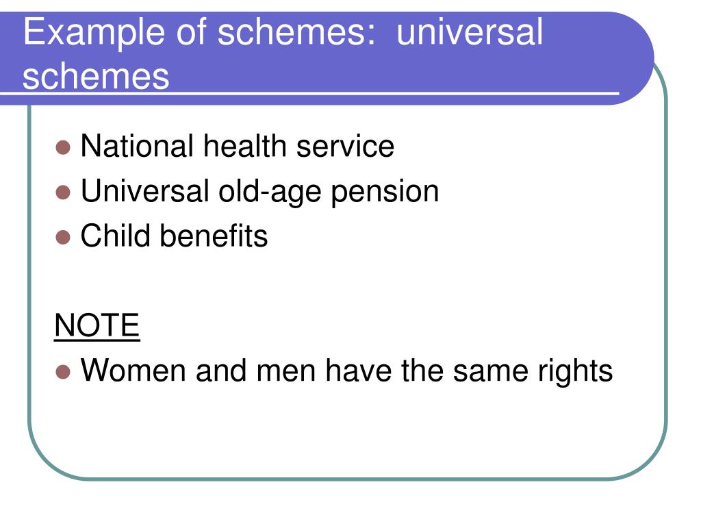 Example of schemes: universal schemes • National health service • Universal old-age pension • Child benefits NOTE • Women and men have the same rights