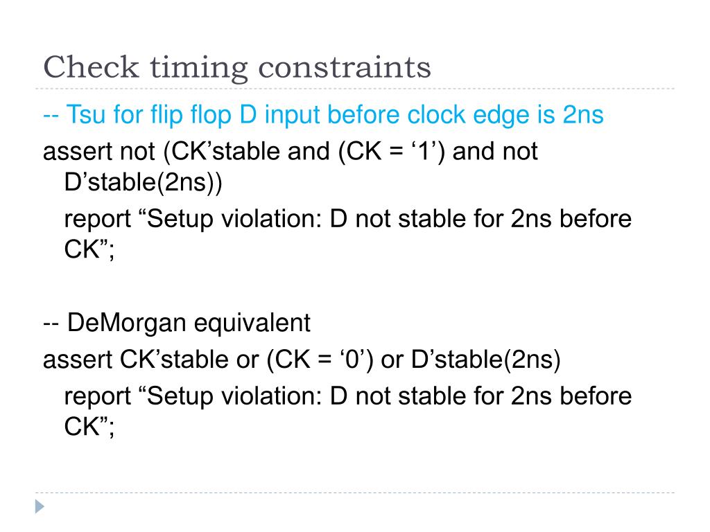 Check timing constraints -- Tsu for flip flop D input before clock edge is 2ns assert not (CK’stable and (CK = ‘1’) and not D’stable(2ns)) report “Setup violation: D not stable for 2ns before CK”; -- DeMorgan equivalent assert CK’stable or (CK = ‘0’) or D’stable(2ns) report “Setup violation: D not stable for 2ns before CK”;