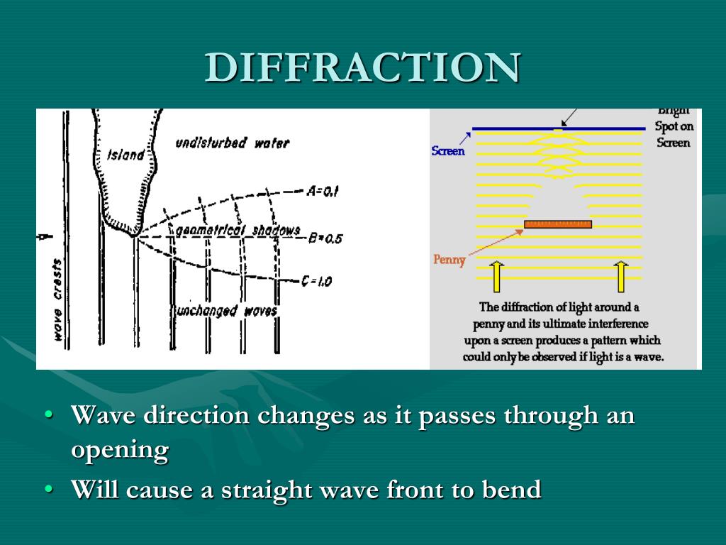 DIFFRACTION • Wave direction changes as it passes through an opening • Will cause a straight wave front to bend