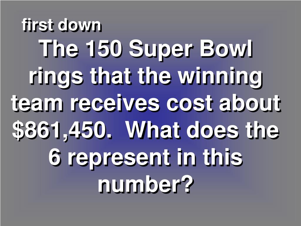 first down The 150 Super Bowl rings that the winning team receives cost about $861,450. What does the 6 represent in this number?