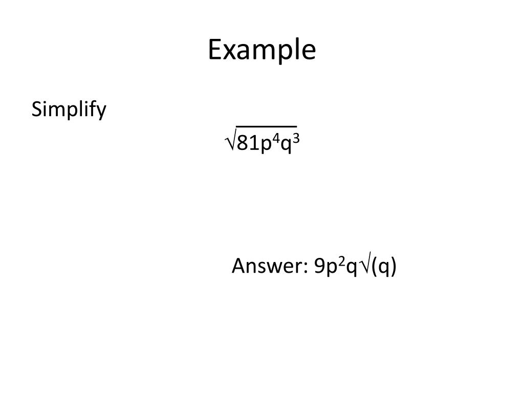 Example Simplify 81p4q3 Answer: 9p2q(q)