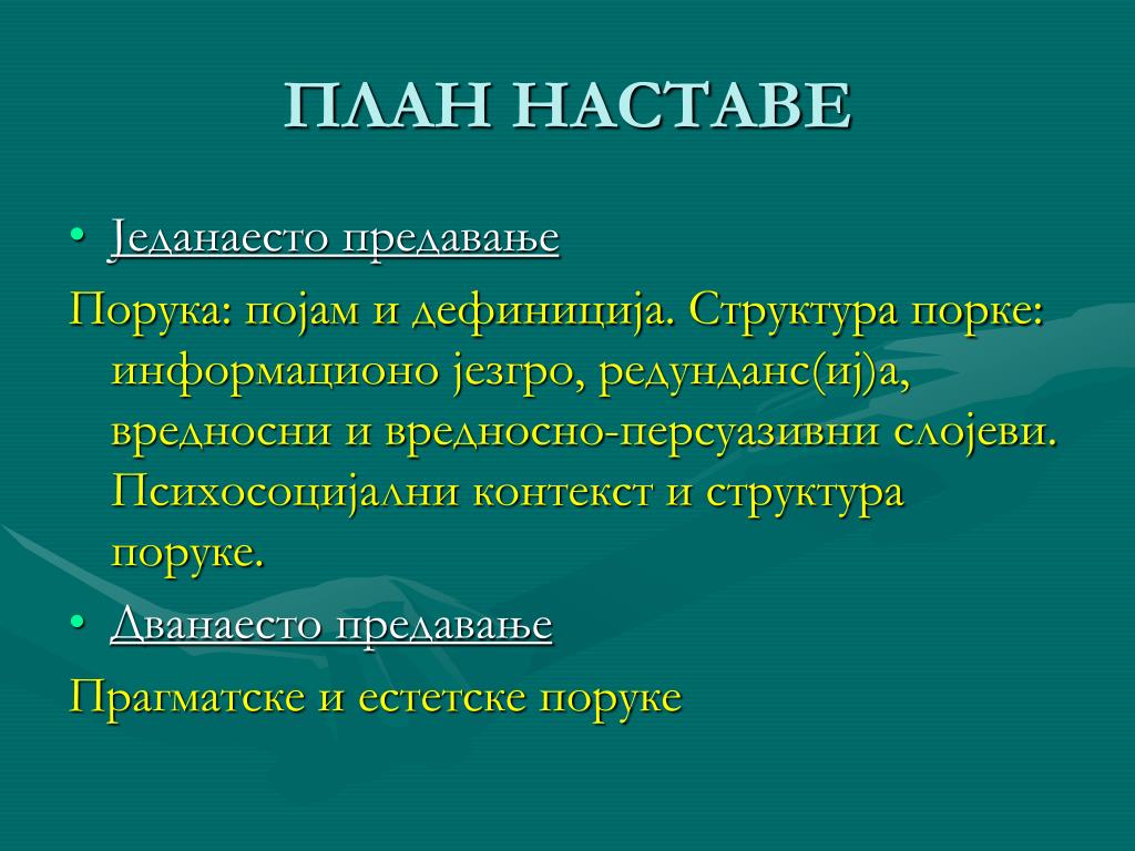 ПЛАН НАСТАВЕ • Једанаесто предавање Порука: појам и дефиниција. Структура порке: информационо језгро, редунданс(иј)а, вредносни и вредносно-персуазивни слојеви. Психосоцијални контекст и структура поруке. • Дванаесто предавање Прагматске и естетске поруке