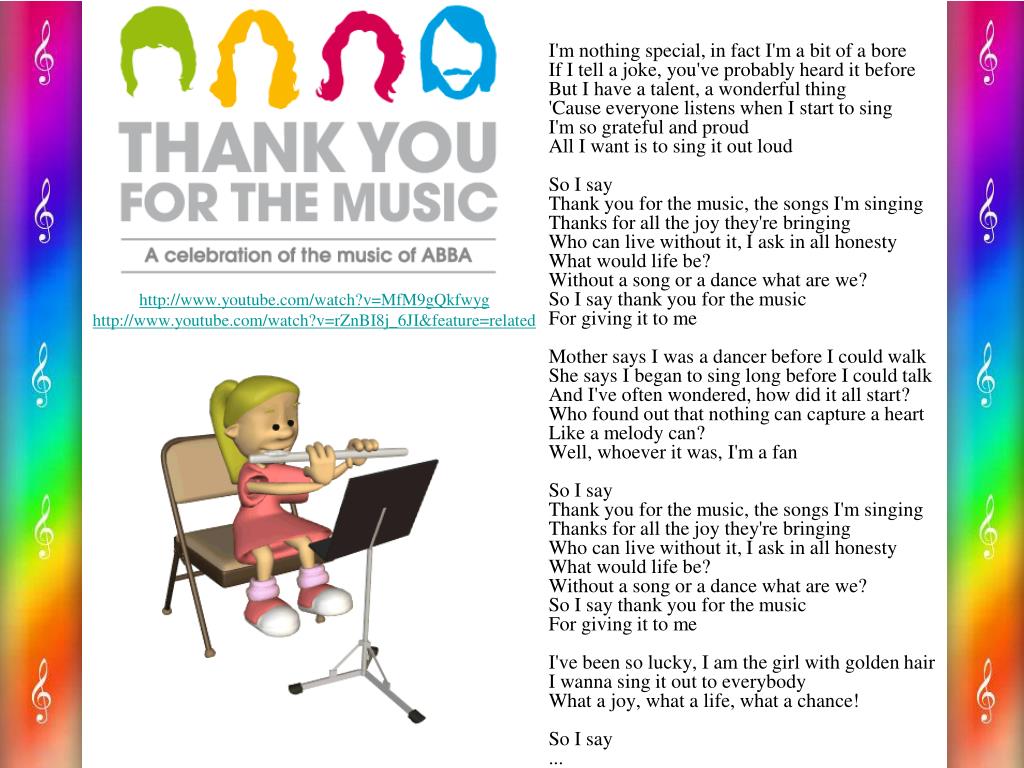 http://www.youtube.com/watch?v=MfM9gQkfwyghttp://www.youtube.com/watch?v=rZnBI8j_6JI&feature=relatedhttp://www.youtube.com/watch?v=MfM9gQkfwyghttp://www.youtube.com/watch?v=rZnBI8j_6JI&feature=related I'm nothing special, in fact I'm a bit of a boreIf I tell a joke, you've probably heard it beforeBut I have a talent, a wonderful thing'Cause everyone listens when I start to singI'm so grateful and proudAll I want is to sing it out loudSo I sayThank you for the music, the songs I'm singingThanks for all the joy they're bringingWho can live without it, I ask in all honestyWhat would life be?Without a song or a dance what are we?So I say thank you for the musicFor giving it to meMother says I was a dancer before I could walkShe says I began to sing long before I could talkAnd I've often wondered, how did it all start?Who found out that nothing can capture a heartLike a melody can?Well, whoever it was, I'm a fanSo I sayThank you for the music, the songs I'm singingThanks for all the joy they're bringingWho can live without it, I ask in all honestyWhat would life be?Without a song or a dance what are we?So I say thank you for the musicFor giving it to meI've been so lucky, I am the girl with golden hairI wanna sing it out to everybodyWhat a joy, what a life, what a chance!So I say...