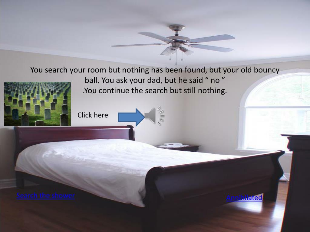You search your room but nothing has been found, but your old bouncy ball. You ask your dad, but he said “ no ”.You continue the search but still nothing. Click here Search the shower Annihilated