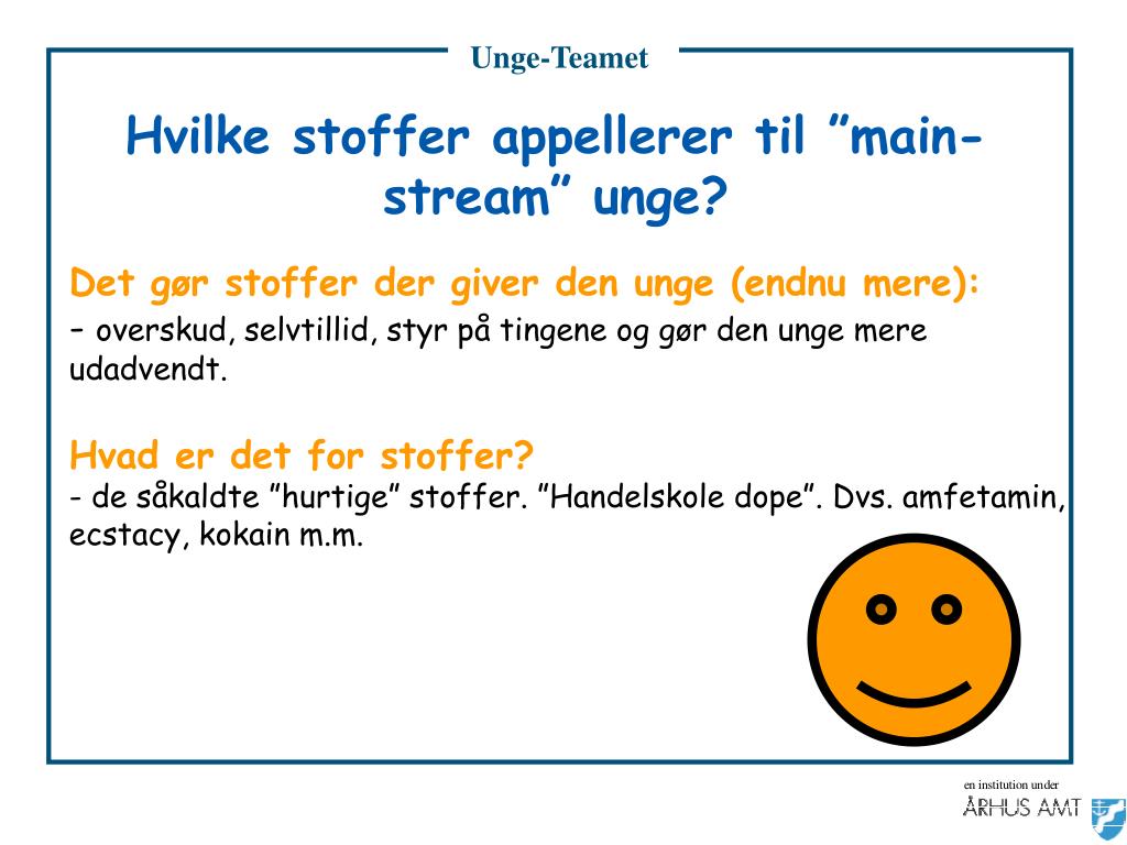 Unge-Teamet Hvilke stoffer appellerer til ”main-stream” unge? Det gør stoffer der giver den unge (endnu mere): - overskud, selvtillid, styr på tingene og gør den unge mere udadvendt. Hvad er det for stoffer? - de såkaldte ”hurtige” stoffer. ”Handelskole dope”. Dvs. amfetamin, ecstacy, kokain m.m.