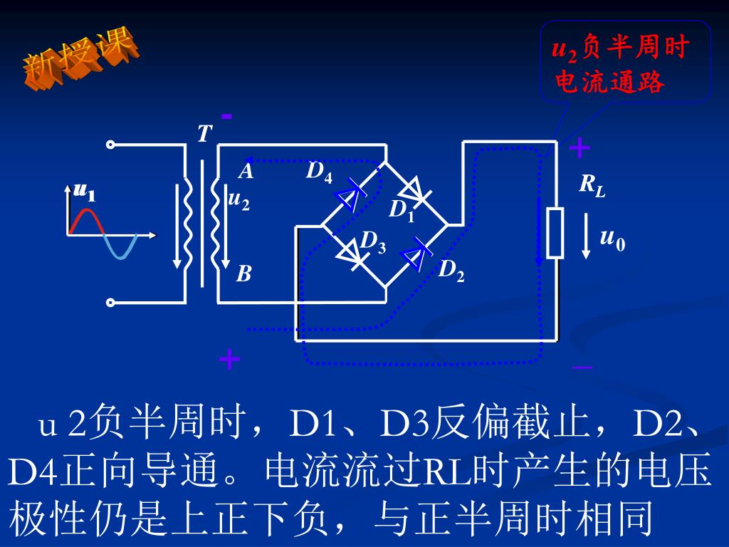 + - - D4 A u1 u2 D1 D3 D2 B _ + + u2负半周时电流通路 新授课 T T RL RL u1 u0 u 2负半周时,D1、D3反偏截止,D2、D4正向导通。电流流过RL时产生的电压极性仍是上正下负,与正半周时相同