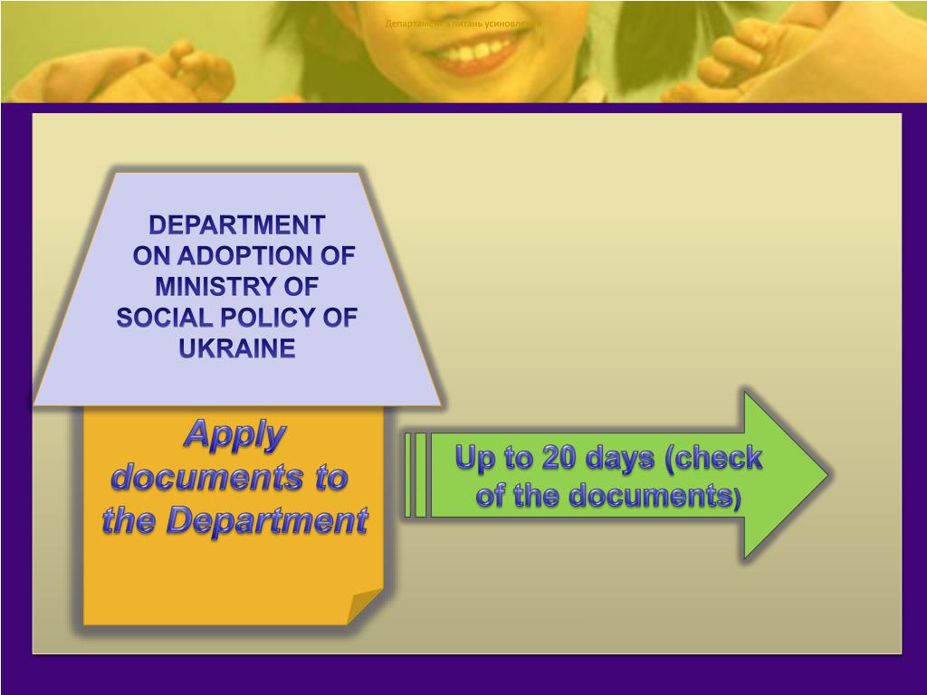 Департамент з питань усиновлення Департамент з питань усиновлення DEPARTMENT ON ADOPTION OFMINISTRY OF SOCIAL POLICY OF UKRAINE Up to 20 days (check of the documents) Apply documents to the Department