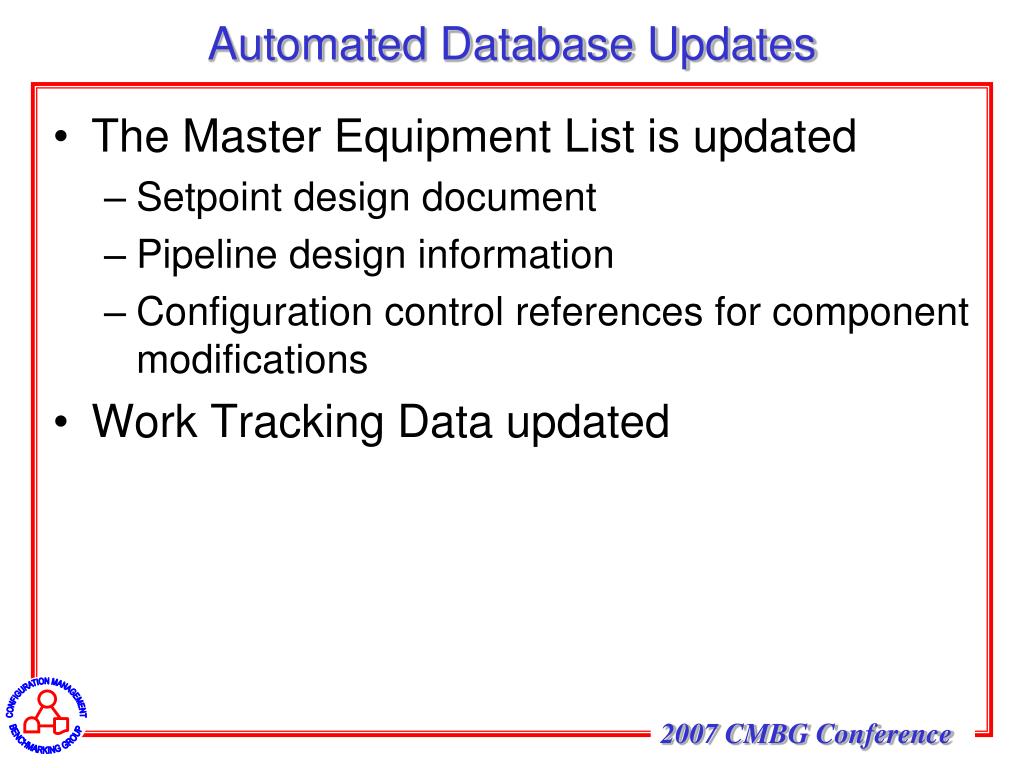 Automated Database Updates • The Master Equipment List is updated • Setpoint design document • Pipeline design information • Configuration control references for component modifications • Work Tracking Data updated