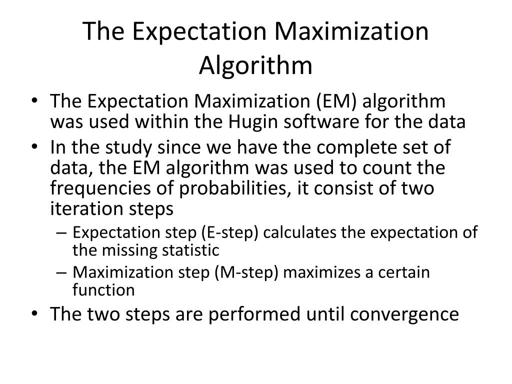 The Expectation Maximization Algorithm • The Expectation Maximization (EM) algorithm was used within the Hugin software for the data • In the study since we have the complete set of data, the EM algorithm was used to count the frequencies of probabilities, it consist of two iteration steps • Expectation step (E-step) calculates the expectation of the missing statistic • Maximization step (M-step) maximizes a certain function • The two steps are performed until convergence