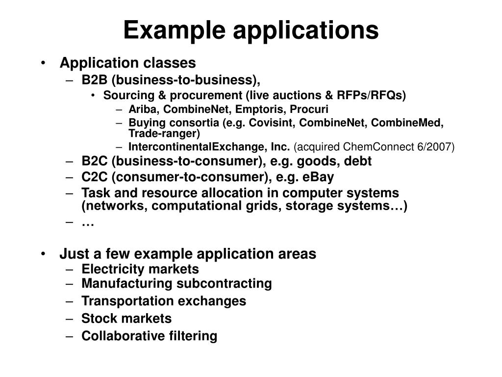 Example applications • Application classes • B2B (business-to-business), • Sourcing & procurement (live auctions & RFPs/RFQs) • Ariba, CombineNet, Emptoris, Procuri • Buying consortia (e.g. Covisint, CombineNet, CombineMed, Trade-ranger) • IntercontinentalExchange, Inc. (acquired ChemConnect 6/2007) • B2C (business-to-consumer), e.g. goods, debt • C2C (consumer-to-consumer), e.g. eBay • Task and resource allocation in computer systems (networks, computational grids, storage systems…) • … • Just a few example application areas • Electricity markets • Manufacturing subcontracting • Transportation exchanges • Stock markets • Collaborative filtering