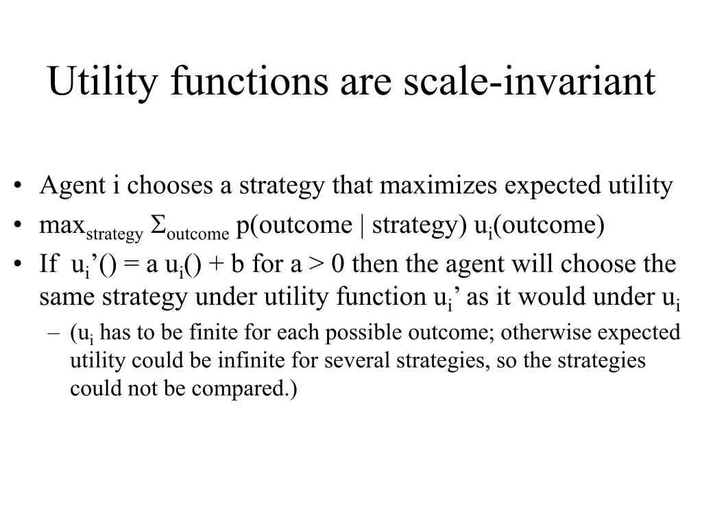 Agent i chooses a strategy that maximizes expected utility maxstrategySoutcome p(outcome | strategy) ui(outcome) If ui’() = a ui() + b for a > 0 then the agent will choose the same strategy under utility function ui’ as it would under ui (ui has to be finite for each possible outcome; otherwise expected utility could be infinite for several strategies, so the strategies could not be compared.) Utility functions are scale-invariant