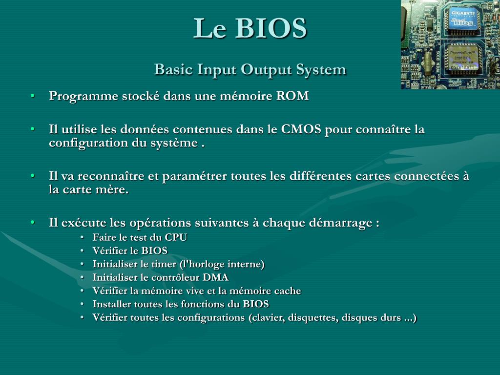 Le BIOSBasic Input Output System • Programme stocké dans une mémoire ROM • Il utilise les données contenues dans le CMOS pour connaître la configuration du système . • Il va reconnaître et paramétrer toutes les différentes cartes connectées à la carte mère. • Il exécute les opérations suivantes à chaque démarrage : • Faire le test du CPU • Vérifier le BIOS • Initialiser le timer (l'horloge interne) • Initialiser le contrôleur DMA • Vérifier la mémoire vive et la mémoire cache • Installer toutes les fonctions du BIOS • Vérifier toutes les configurations (clavier, disquettes, disques durs ...)
