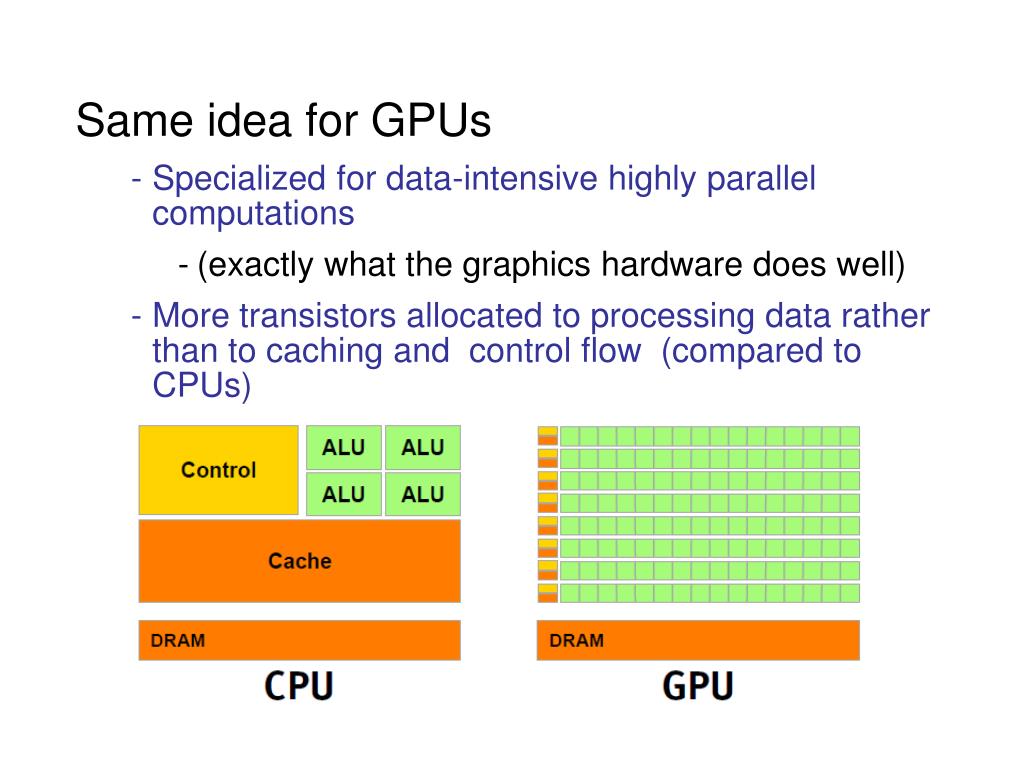 Same idea for GPUs • Specialized for data-intensive highly parallel computations • (exactly what the graphics hardware does well) • More transistors allocated to processing data rather than to caching and control flow (compared to CPUs)