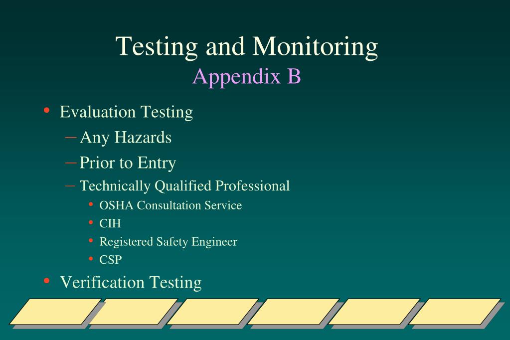 Testing and MonitoringAppendix B • Evaluation Testing • Any Hazards • Prior to Entry • Technically Qualified Professional • OSHA Consultation Service • CIH • Registered Safety Engineer • CSP • Verification Testing