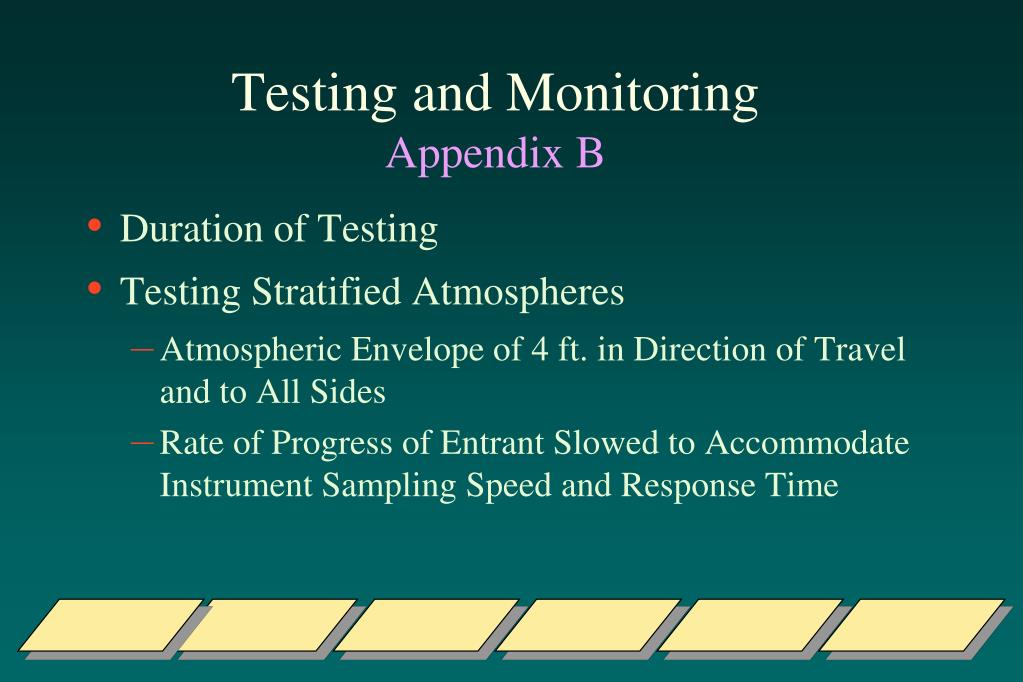 Testing and MonitoringAppendix B • Duration of Testing • Testing Stratified Atmospheres • Atmospheric Envelope of 4 ft. in Direction of Travel and to All Sides • Rate of Progress of Entrant Slowed to Accommodate Instrument Sampling Speed and Response Time