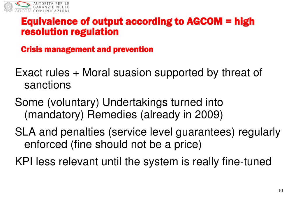 Equivalence of output according to AGCOM = high resolution regulation • Crisis management and prevention • Exactrules + Moral suasion supported by threat of sanctions • Some (voluntary) Undertakingsturnedinto (mandatory) Remedies (already in 2009) • SLA and penalties (service levelguarantees) regularlyenforced (fine shouldnot be a price) • KPI lessrelevantuntil the systemisreally fine-tuned