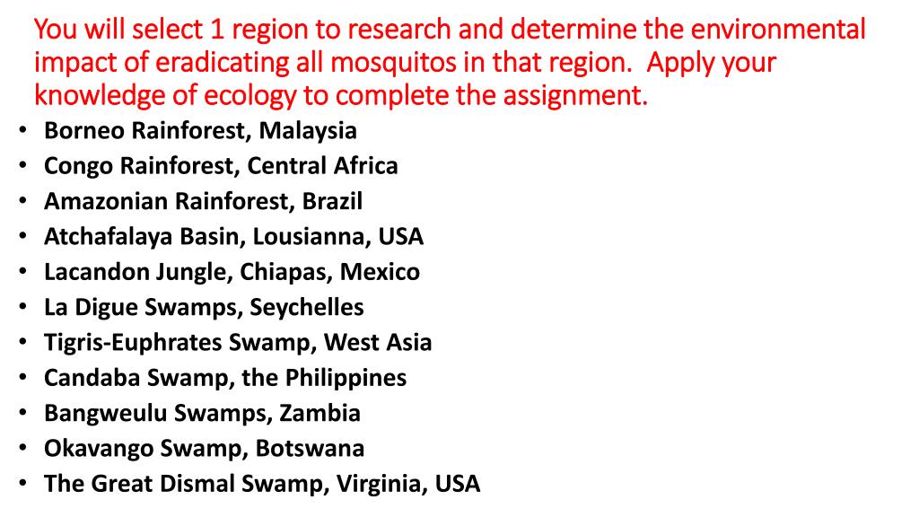 You will select 1 region to research and determine the environmental impact of eradicating all mosquitos in that region. Apply your knowledge of ecology to complete the assignment. Borneo Rainforest, Malaysia Congo Rainforest, Central Africa Amazonian Rainforest, Brazil Atchafalaya Basin, Lousianna, USA Lacandon Jungle, Chiapas, Mexico La Digue Swamps, Seychelles Tigris-Euphrates Swamp, West Asia Candaba Swamp, the Philippines Bangweulu Swamps, Zambia Okavango Swamp, Botswana The Great Dismal Swamp, Virginia, USA