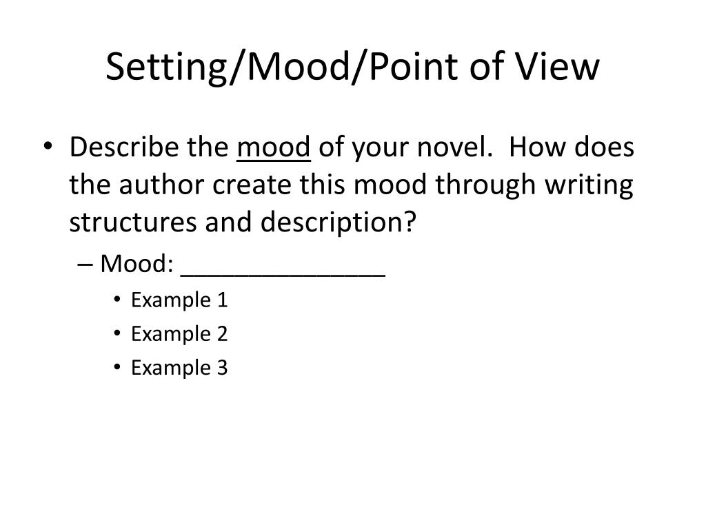 Setting/Mood/Point of View • Describe the mood of your novel. How does the author create this mood through writing structures and description? • Mood: _______________ • Example 1 • Example 2 • Example 3