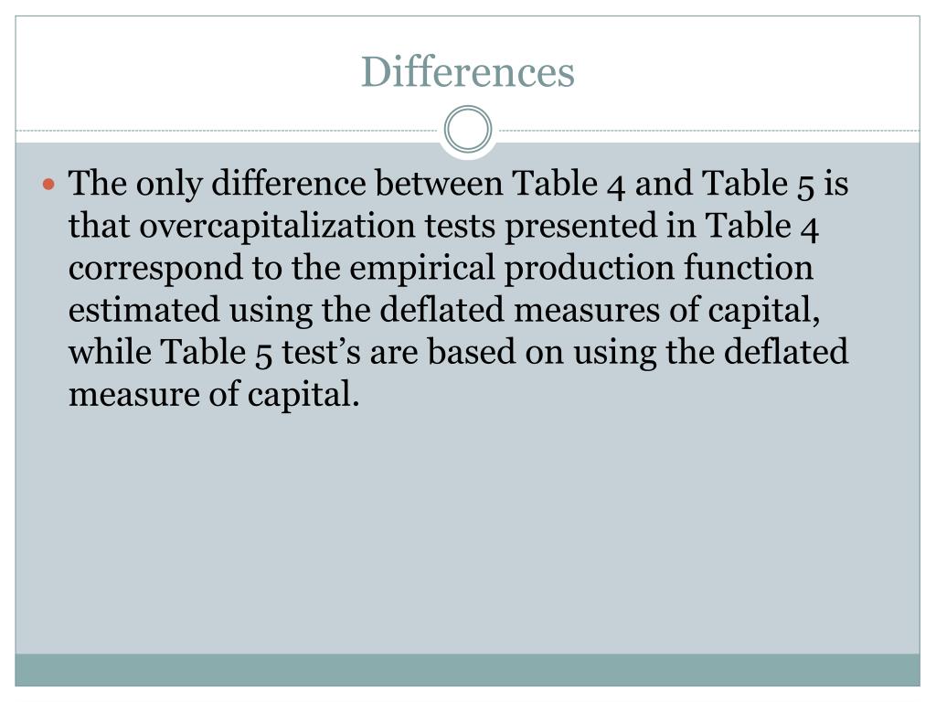 Differences The only difference between Table 4 and Table 5 is that overcapitalization tests presented in Table 4 correspond to the empirical production function estimated using the deflated measures of capital, while Table 5 test’s are based on using the deflated measure of capital.