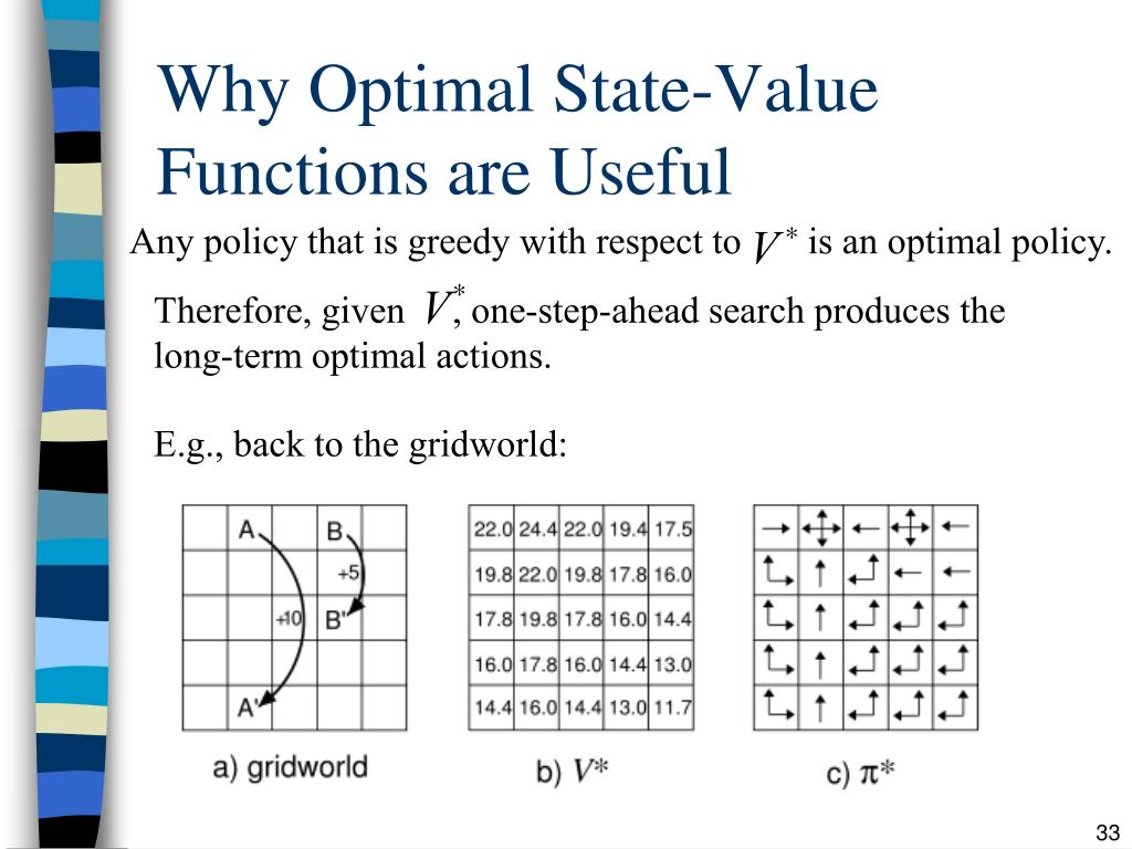 Why Optimal State-Value Functions are Useful Any policy that is greedy with respect to is anoptimal policy. Therefore, given , one-step-ahead search produces the long-term optimal actions. E.g., back to the gridworld: