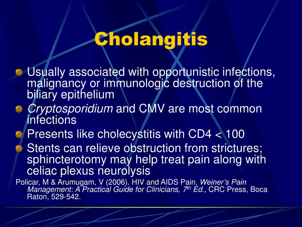 Cholangitis • Usually associated with opportunistic infections, malignancy or immunologic destruction of the biliary epithelium • Cryptosporidium and CMV are most common infections • Presents like cholecystitis with CD4 < 100 • Stents can relieve obstruction from strictures; sphincterotomy may help treat pain along with celiac plexus neurolysis Policar, M & Arumugam, V (2006). HIV and AIDS Pain, Weiner’s Pain Management: A Practical Guide for Clinicians, 7th Ed., CRC Press, Boca Raton, 529-542.
