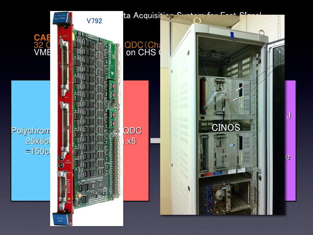 V792 CINOS Development of Data Acquisition System for Fast SIgnal CAEN V792 32 Channel Multi-event QDC(Charge-to-Digital Conversion) VME bus system based on CHS CINOS system Polychromators 25x6ch. =150ch. V792 QDC 32ch.x5 CINOS Controller Memory VME CAMAC Heliotron J Fedora Linux Data base