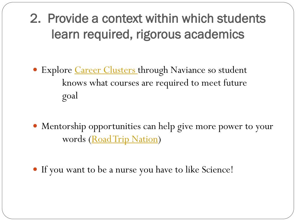 2. Provide a context within which students learn required, rigorous academics • Explore Career Clusters through Naviance so student knows what courses are required to meet future goal • Mentorship opportunities can help give more power to your words (Road Trip Nation) • If you want to be a nurse you have to like Science!
