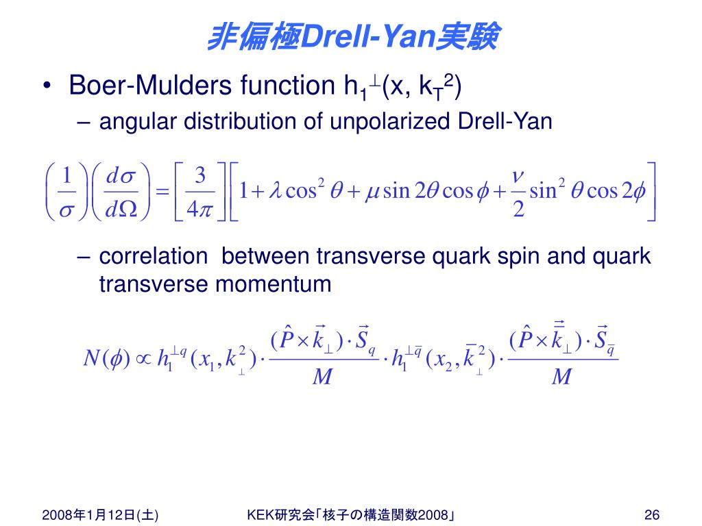非偏極Drell-Yan実験 • Boer-Mulders function h1(x, kT2) • angular distribution of unpolarized Drell-Yan • correlation between transverse quark spinand quark transverse momentum KEK研究会「核子の構造関数2008」