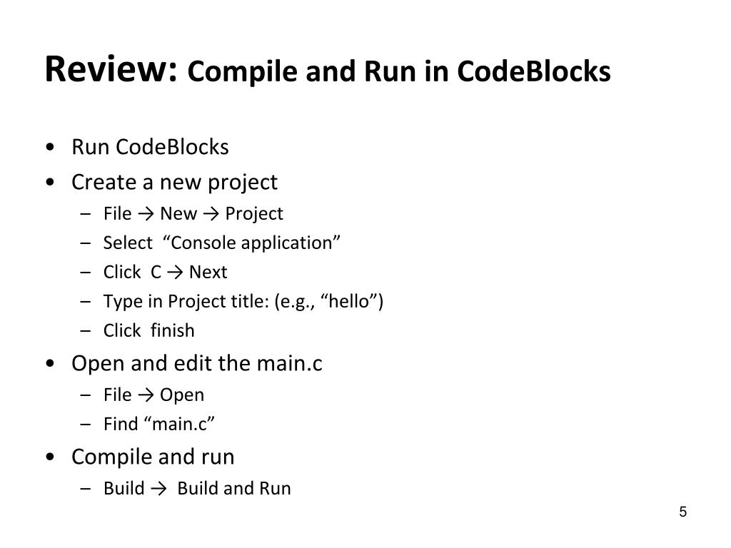 Review: Compile and Run in CodeBlocks • Run CodeBlocks • Create a new project • File → New → Project • Select “Console application” • Click C → Next • Type in Project title: (e.g., “hello”) • Click finish • Open and edit the main.c • File → Open • Find “main.c” • Compile and run • Build → Build and Run