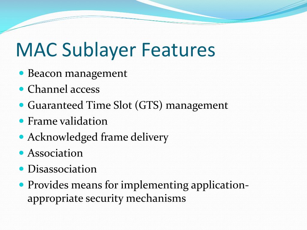MAC Sublayer Features • Beacon management • Channel access • Guaranteed Time Slot (GTS) management • Frame validation • Acknowledged frame delivery • Association • Disassociation • Provides means for implementing application-appropriate security mechanisms