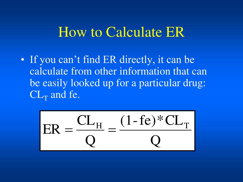 How to Calculate ER • If you can’t find ER directly, it can be calculate from other information that can be easily looked up for a particular drug: CLT and fe.