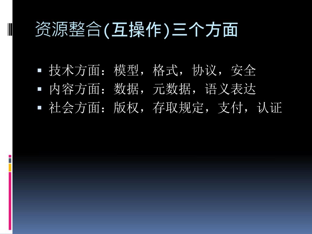资源整合(互操作)三个方面 • 技术方面:模型,格式,协议,安全 • 内容方面:数据,元数据,语义表达 • 社会方面:版权,存取规定,支付,认证