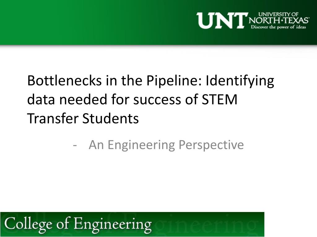 College of Engineering. Dr. Vijay Vaidyanathan Associate Dean – Undergraduate Studies UNT College of Engineering. Bottlenecks in the Pipeline: Identifying data needed for success of STEM Transfer Students. An Engineering Perspective. Objective. Identification of potential ‘problem’ areas: