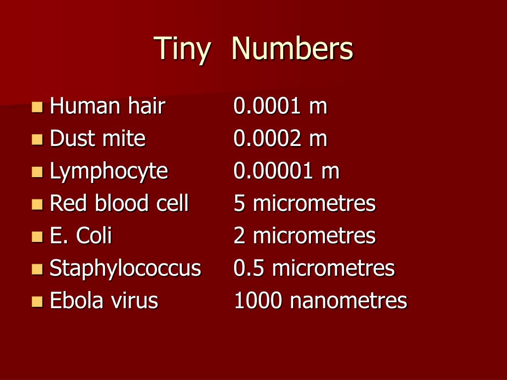 Tiny Numbers • Human hair 0.0001 m • Dust mite 0.0002 m • Lymphocyte 10 micrometres • Red blood cell 5 micrometres • E. Coli 2 micrometres • Staphylococcus 0.5 micrometres • Ebola virus 1000 nanometres