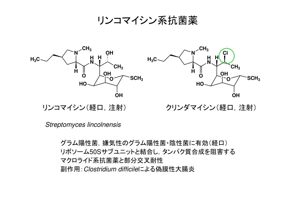 リンコマイシン系抗菌薬 リンコマイシン(経口,注射) クリンダマイシン(経口,注射) Streptomyces lincolnensis グラム陽性菌,嫌気性のグラム陽性菌・陰性菌に有効(経口) リボソーム50Sサブユニットと結合し,タンパク質合成を阻害する マクロライド系抗菌薬と部分交叉耐性 副作用:Clostridium difficileによる偽膜性大腸炎