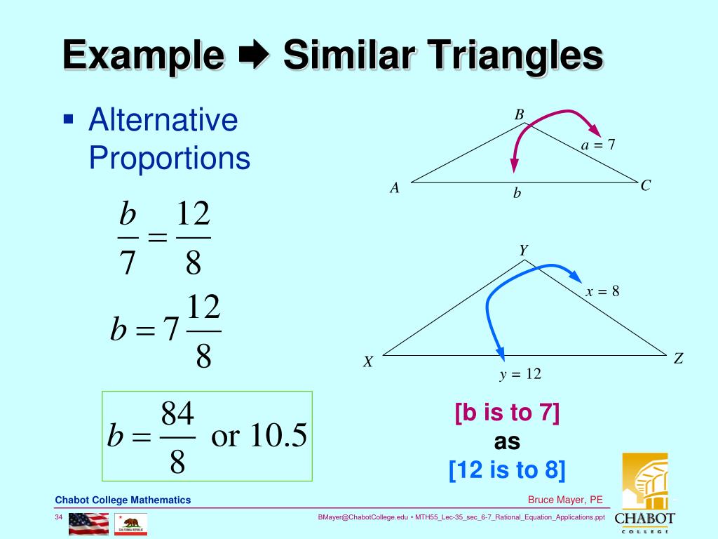 Example Similar Triangles • Set Up TheProportions B a = 7 C A b Y x = 8 Z X y = 12 [b is to 12] as[7 is to 8]