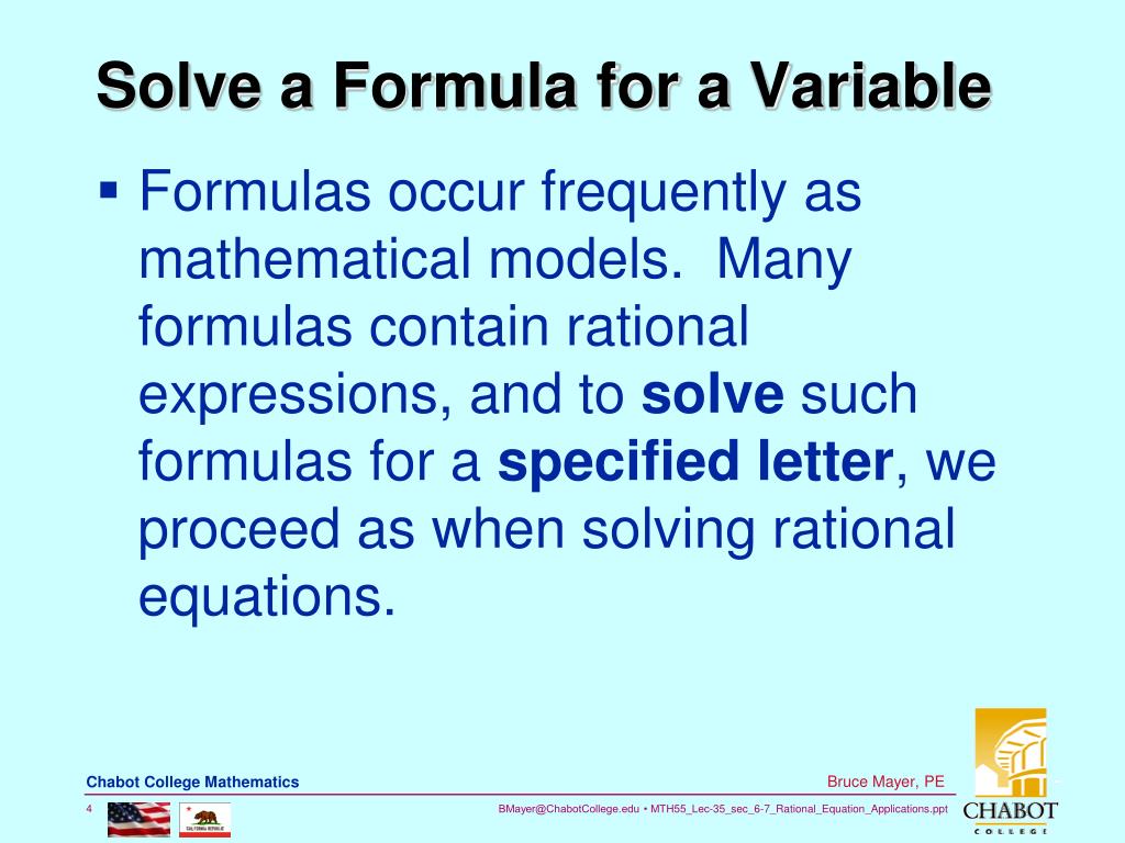 Solve a Formula for a Variable • Formulas occur frequently as mathematical models. Many formulas contain rational expressions, and to solve such formulas for a specified letter, we proceed as when solving rational equations.