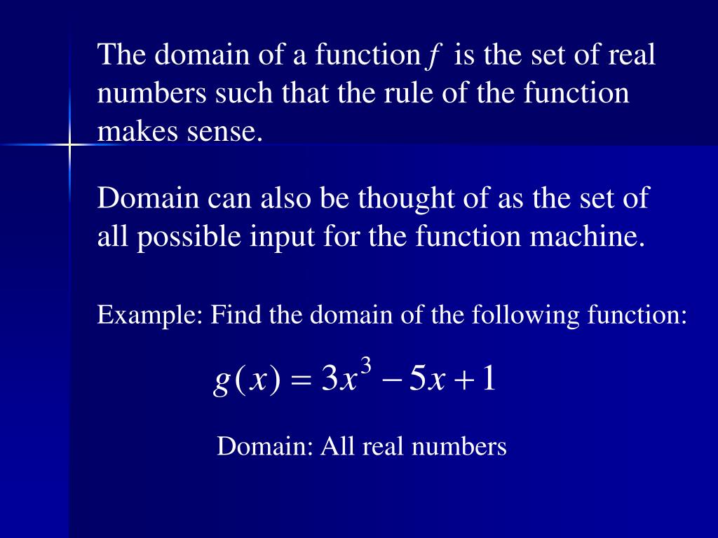 The domain of a function f is the set of real numbers such that the rule of the function makes sense. Domain can also be thought of as the set of all possible input for the function machine. Example: Find the domain of the following function: Domain: All real numbers