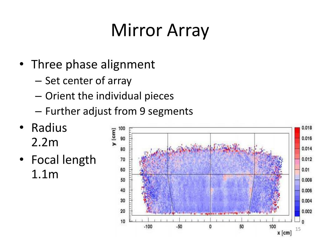 Mirror Array • Three phase alignment • Set center of array • Orient the individual pieces • Further adjust from 9 segments • Radius 2.2m • Focal length 1.1m