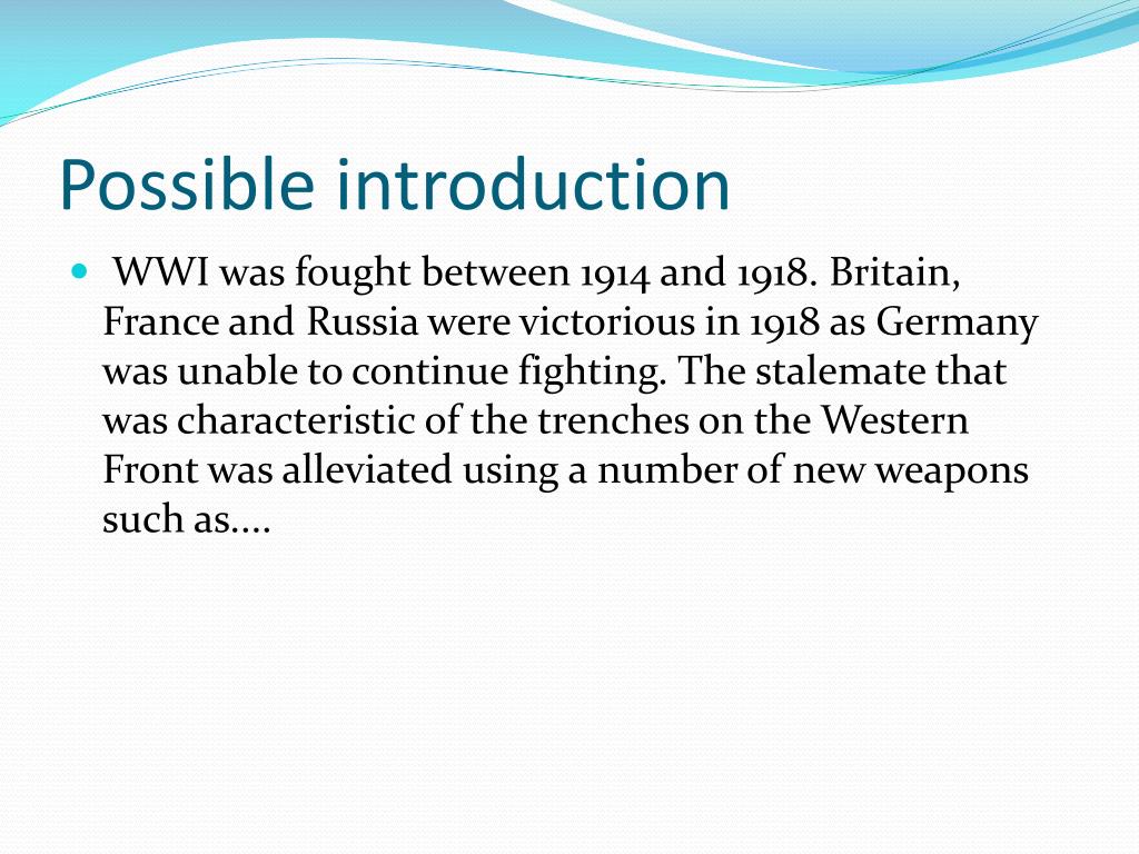 Possible introduction • WWI was fought between 1914 and 1918. Britain, France and Russia were victorious in 1918 as Germany was unable to continue fighting. The stalemate that was characteristic of the trenches on the Western Front was alleviated using a number of new weapons such as....